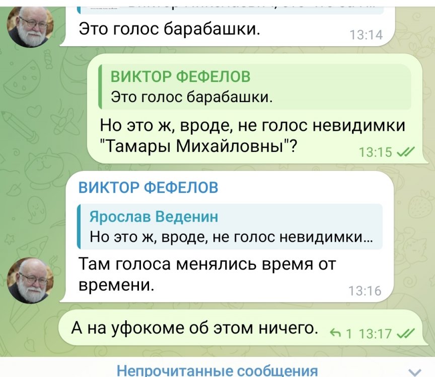 И опять же про параллели, Илья. Они могут быть прямыми, но мы их не видим. Я ведь не зря спрашиваю, что за голос звучит на 4:57? Это голос полтера? Мне он почему-то кажется знакомым, но могу ошибаться. Не зря Виктор Николаевич просит Светлану В. послушать эту запись. Вдруг кого-то узнает? Кстати, при сопоставлении голосов с разных локаций фоноскопия как раз может оказаться полезной.