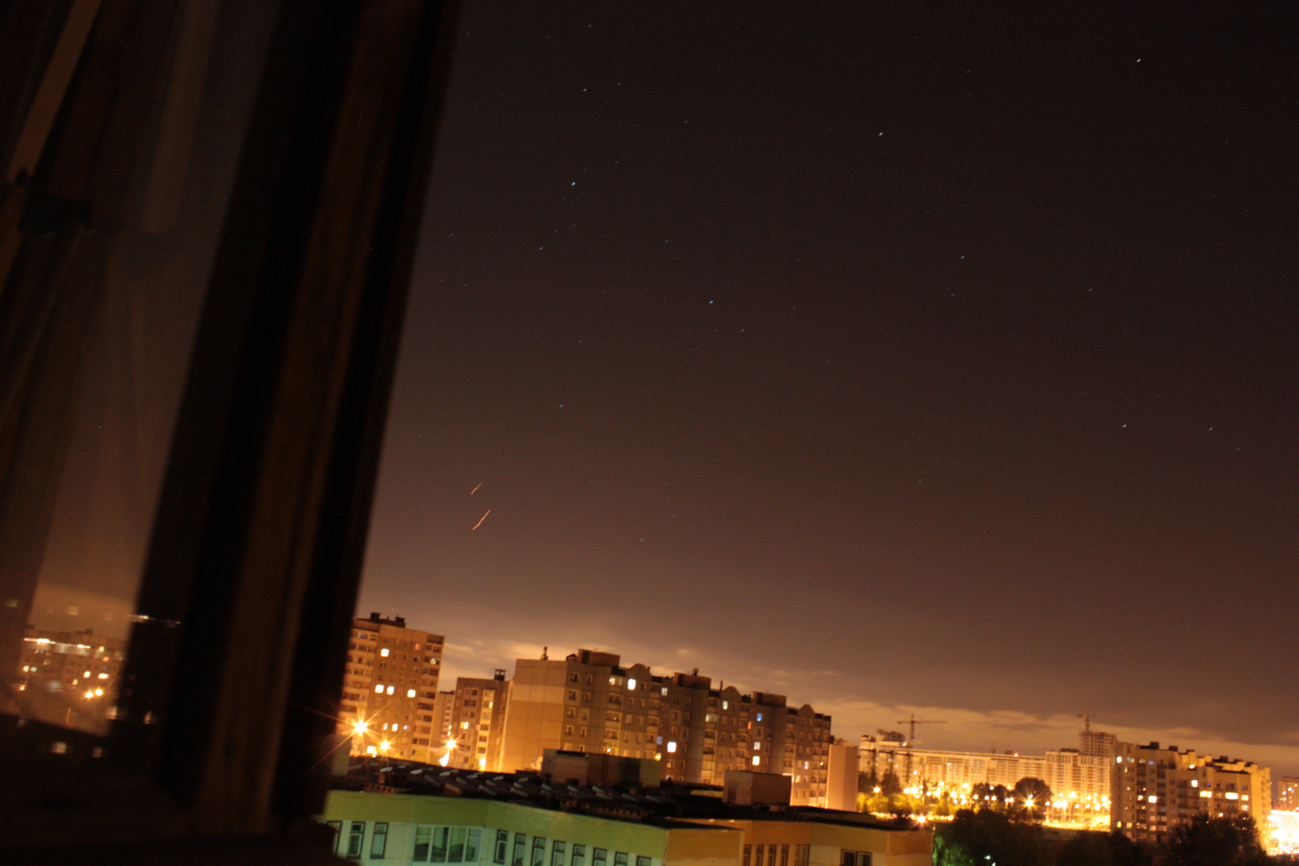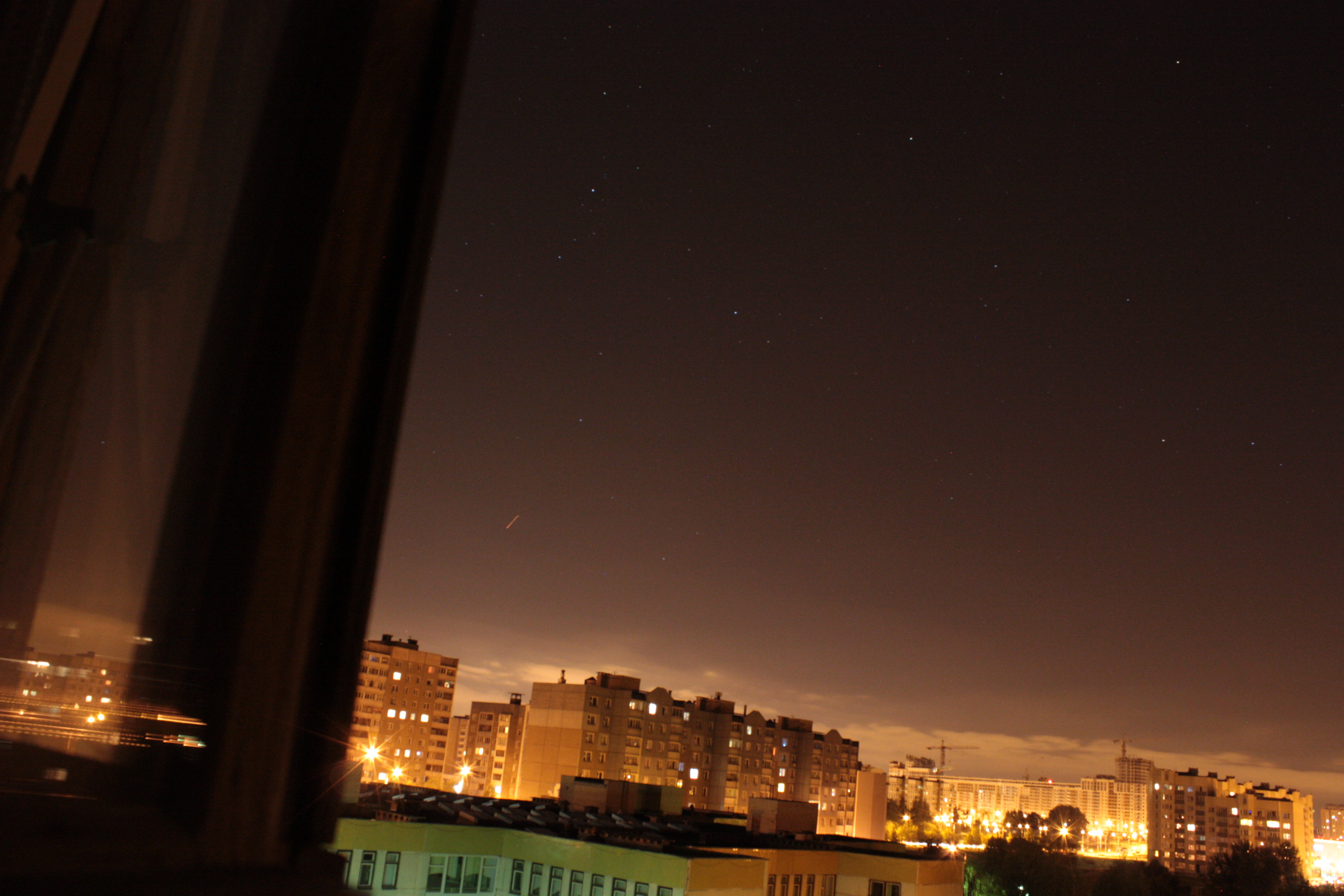 Тоже наблюдал самолет (примерно 23.15), прямолинейная траетория на северо-запад, помимо навигационных мерцающих огней был включён источник света желто-белого цвета, яркость примерно 2-ой величины, отчетливо прослушивались шумы двигателя самолета.