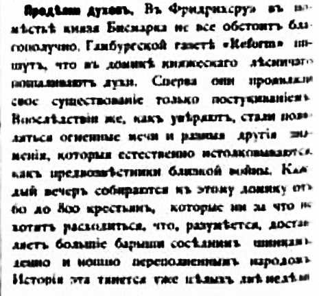 Проделки духов. - В Фридрихсруэ в поместье князя Бисмарка не все обстоит благополучно. Гамбургской газете "Reform" пишут, что в домике княжеского лесничего пошаливают духи. Сперва они проявляли свое существование только постукиванием. Впоследствие же, как уверяют, стали появляться огненные мечи и разные другие знамения, которые естественно истолковываются, как предвестники близкой войны. Каждый вечер собираются к этому домику от 60 до 800 крестьян, которые ни за что не хотят расходиться, что, разумеется, доставляет большие барыши соседним шинкам, денно и нощно переполненным народом. История эта тянется уже целых две недели.