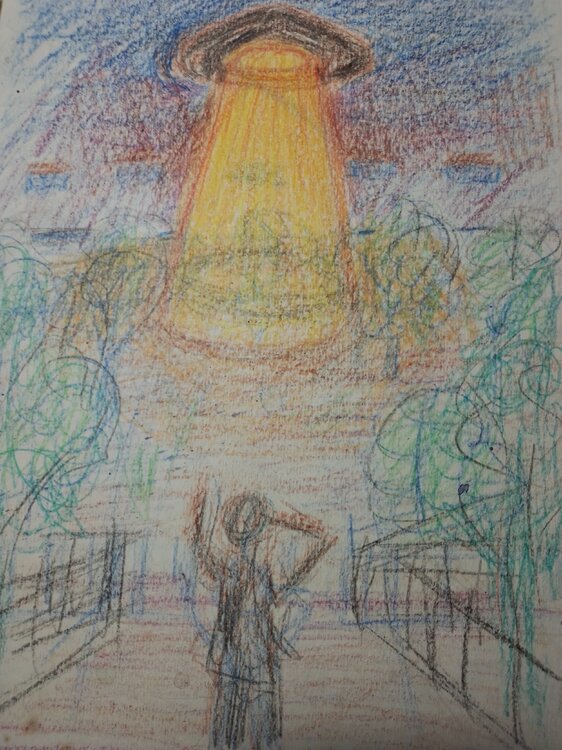 Если бы несколько лет назад, мне сказали, что я буду писать на эту тему - наверное, покрутил бы пальцем у виска. Всю свою сознательную жизнь, я с насмешкой относился к уфологам – людям, изучающим НЛО. Думал - взрослые, а занимаются детскими играми. Так бы, наверное, и прожил Фомой неверующим, если бы не случай, произошедший со мной в ночь с 26-го на 27 июля 2013 года. Дело было на даче. Жара стояла днем и ночью. Ни малейшего дуновения. В доме, не смотря на открытые окна, дышать было нечем, вот и вышел я около часа ночи во двор. Тишина… стою, любуюсь звездным небом. Вдруг вижу со стороны соседнего дачного поселка, а это метров 600 от нас, движется прямо на меня яркий оранжевый свет. Движется быстро, горизонтально, точно на меня и абсолютно бесшумно. Это меня и удивило. Когда над нами пролетают самолеты на высоте 8 -10 километров, то их хорошо слышно. Тут же высота всего метров 200 - 400, а звука нет. Признаюсь – опешил. А свет уже совсем рядом и по мере приближения стал эллипсом, а потом и ясно различимым светящимся тором. По спектру, такой свет бывает у некоторых типов газоразрядных ламп, только этот был очень ярким. И только тогда, когда оранжевый бублик подлетел совсем близко, я на фоне ночного неба разглядел более черный силуэт над ним. Обычно, на картинках, НЛО изображают круглыми как тарелки, я же увидел силуэт как равнобедренный треугольник с закругленными углами. Летел объект прямо на меня, и мне приходилось задирать голову все выше и выше. Когда объект оказался прямо над головой, я уже ничего не видел, так как ослепил светящийся тор. И в один миг все исчезло. То ли свет погас, то ли объект свечкой улетел вверх. Ошарашенный, я еще долго крутил головой, смотрел в ночное небо и пытался понять, что же это было. Метеориты видел, шаровые молнии видел, а такого чуда - никогда. Вот так смеялся над фантазерами – уфологами и, досмеялся. Не верить собственным глазам у меня не было оснований. А кому расскажешь – как минимум сочувственно покивают головой, мол, у каждого свои тараканы в голове. И все-таки я рискнул, и утром поделился новостью со знакомым по даче – отставным майором. К моему изумлению, он ничуть не удивился и сказал, что уже два раза видел нечто подобное. Спрашиваю, почему не рассказывал? А причина все та же, боялся, что засмеют. Вот так на старости лет я и познакомился с неопознанным летающим объектом. Тогда, по свежей памяти и тем, что под руку попало, сделал набросок (он на первом фото). Несколько ночей выходил в надежде увидеть такое чудо ещё раз, но напрасно. Постепенно, за повседневной суетой, этот случай как-то забылся. И вот не так давно копаясь в бумагах, нашел этот набросок и решил написать маслом на картоне А4. Вот, что из этого получилось… там же написал место и дату.